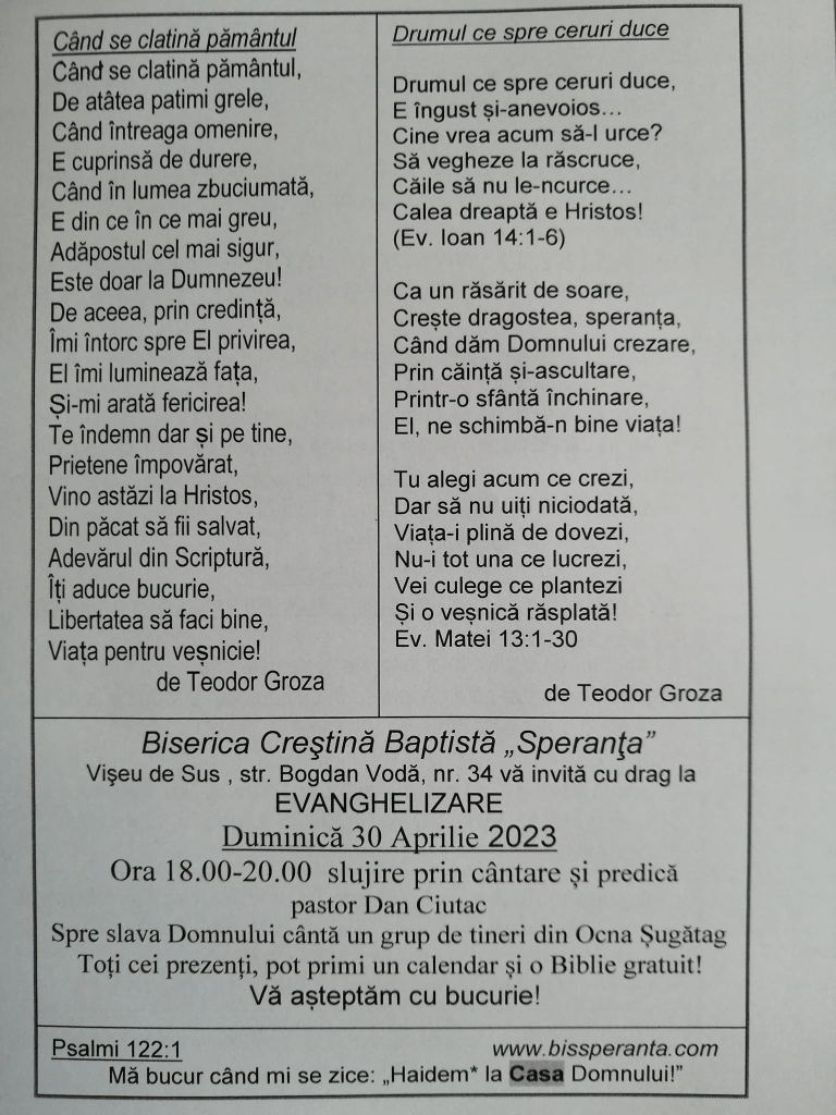 • Vrei să citeşti Biblia dar nu ai una? Vino la serviciile de închinare din Biserica „Speranţa” şi vei primi o Biblie gratuit!